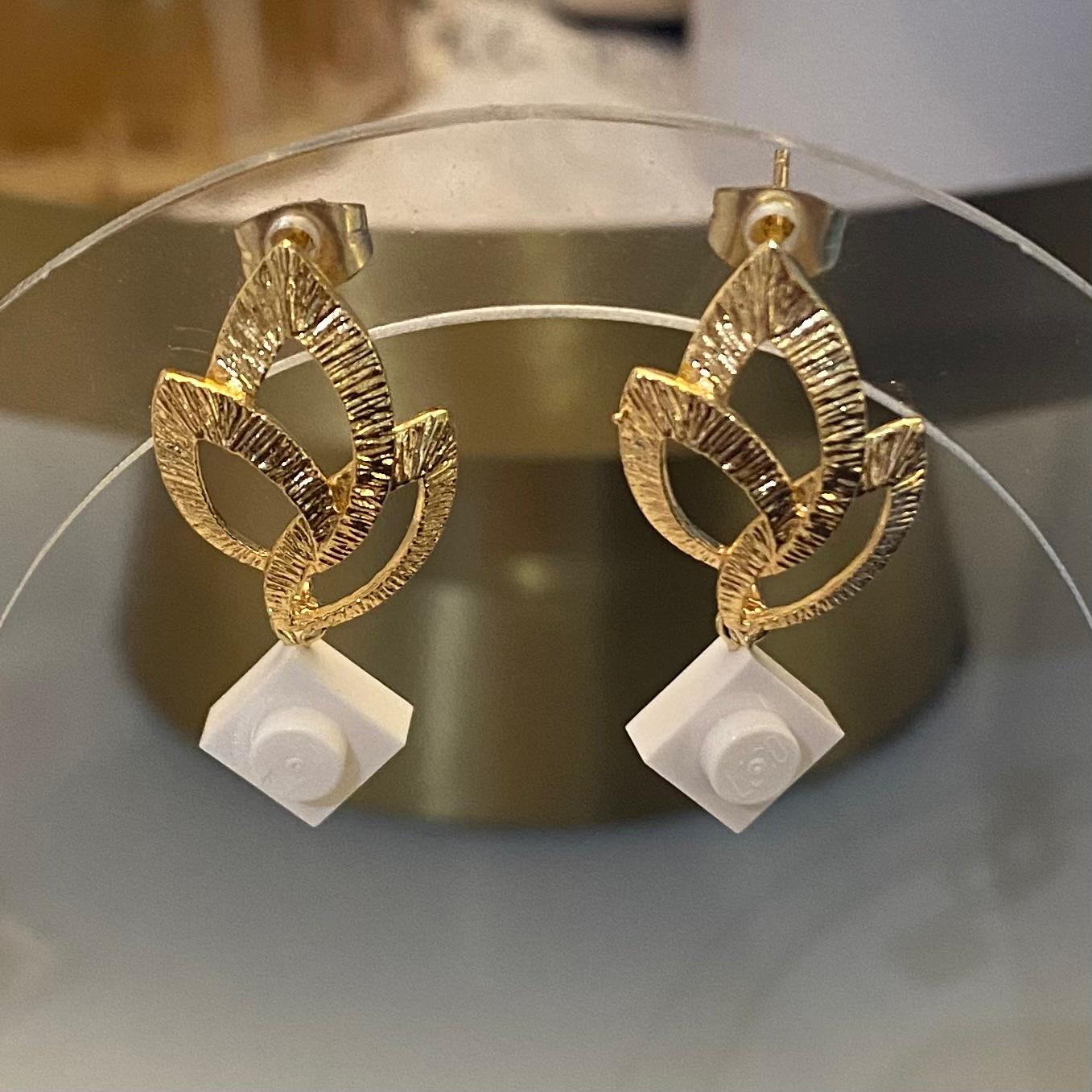 Boucles d'oreilles flammes dorées et Lego® carré - Les Enflammeuses