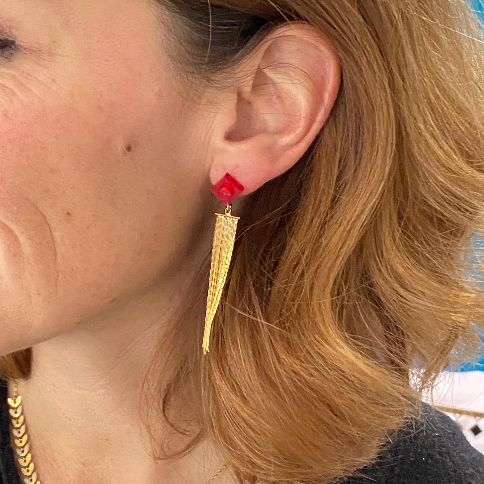 Les Sulfureuses incarnent l'audace festive avec leurs pampilles délicatement suspendues à une brique de Lego. Légères et raffinées, ces boucles d'oreilles transforment chaque soirée en moment de style affirmé.