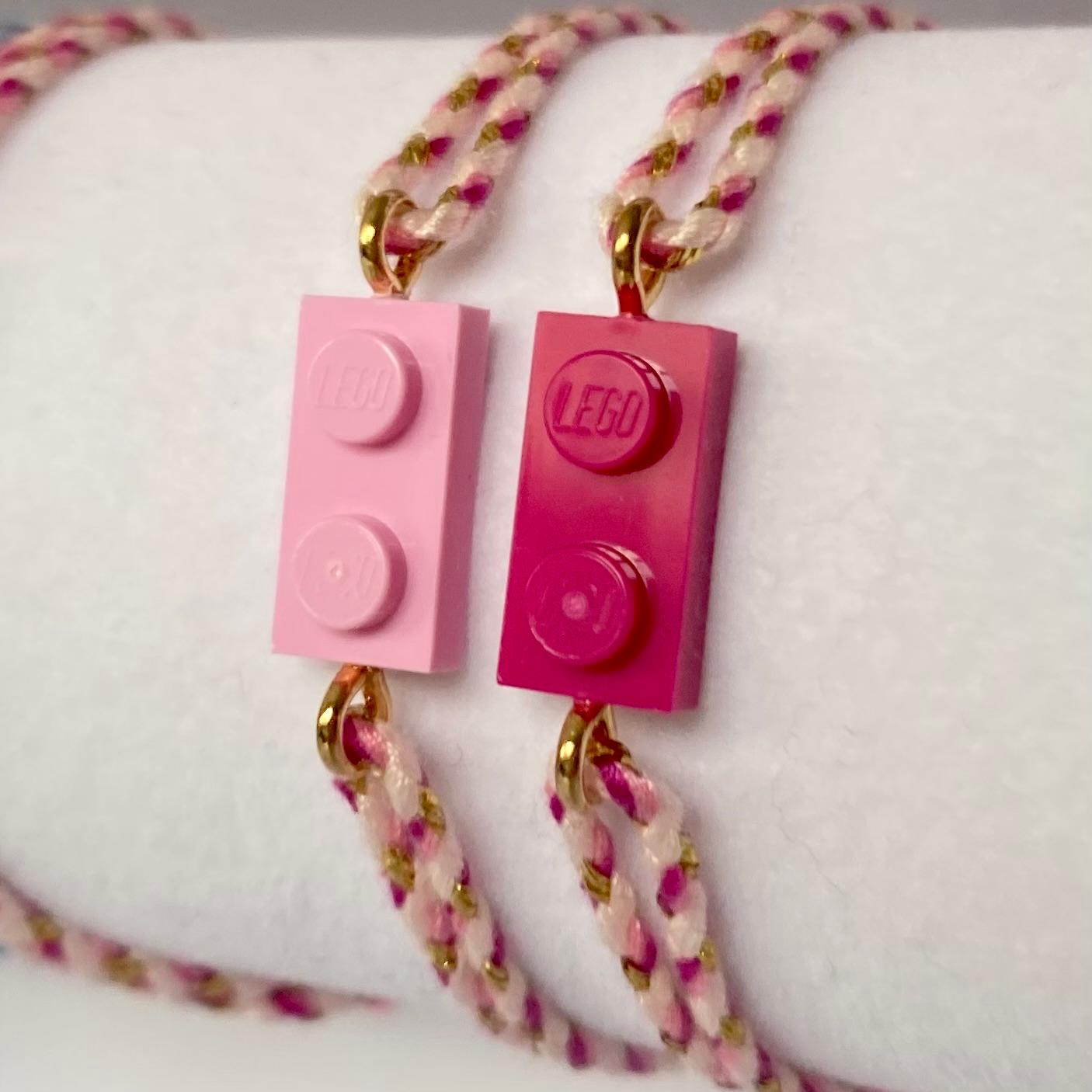 Ravissant ce bracelet avec un cordon tressé rose et doré et sa brique de Lego assortie !